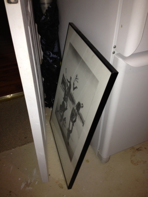 It is currently sitting idly beside our refrigerator in the basement behind a door; hidden from view and any visitors coming in and giving him that perplexed “WTF?” look.  At least, that’s the look he thinks people will give him.  I, on the other hand, would expect expressions of  “Gee, that’s the best black and white print of guys playing instruments on water while jumping excitedly, that I have ever seen!” and “Where did you get such one of a kind art?” and the BEST comment EVER:  “That’s fucking awesome”.  Yeah, that’s what I expect.  I think the general public should be given the opportunity to comment on the complete awesomeness of my taste in musical art.  I have taken a picture of my print for your perusal.  Comment below.