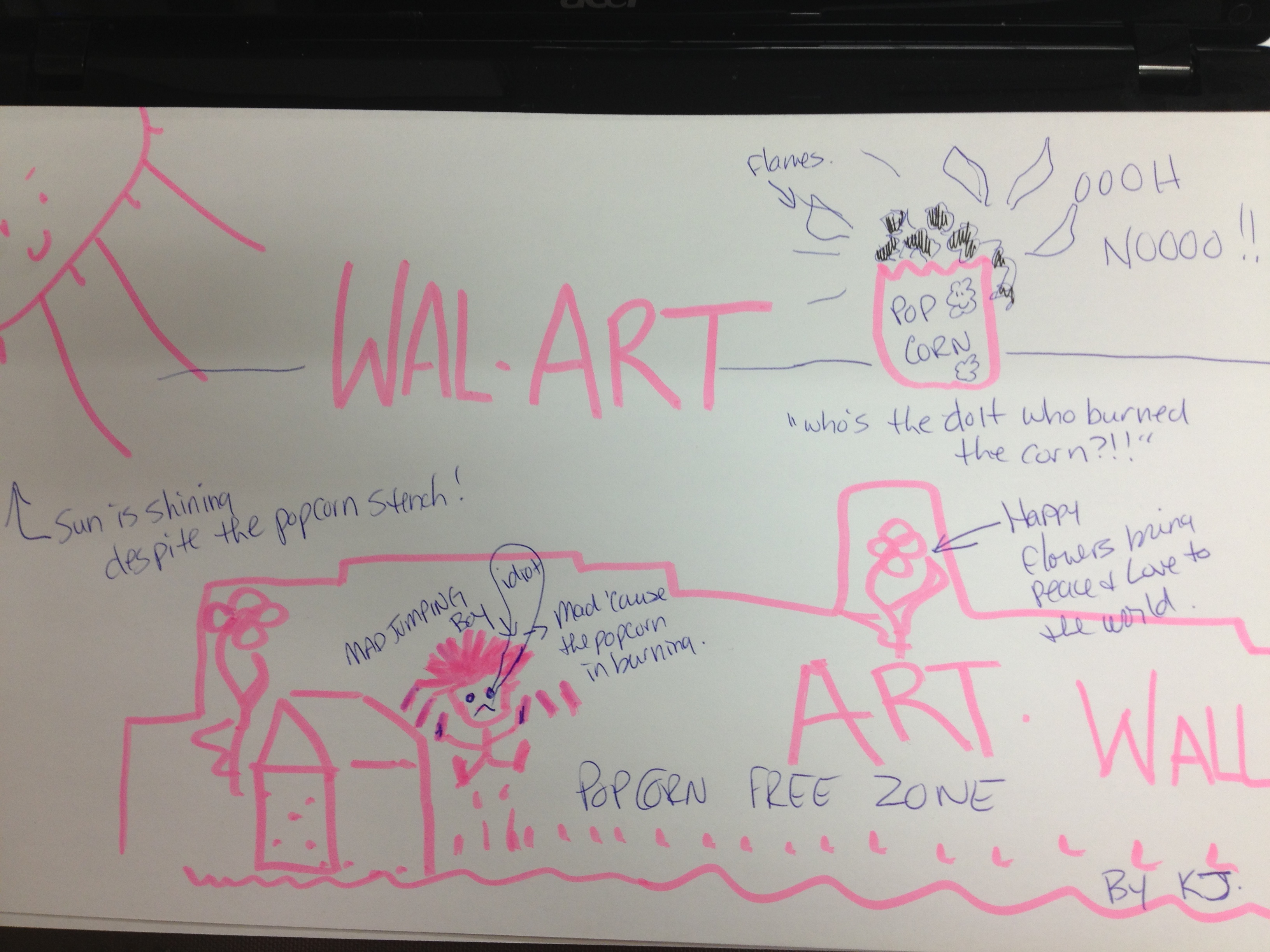 Son’s book bag took to hiding this morning. My pictorial version of the events, with Mags the Wonder Dog looking on in all of her cuteness. My artistic talent knows no bounds!! We sent son off to school thinking he left it on the bus. Oops, our bad. Turns out, D1 had taken his book bag down to her room the night before mistakenly thinking it was hers…they’re both black. Hence, the argument for hers to have some colour in it and not simply the big MEMORIAL UNIVERSITY written on the outside in white lettering. Yeah.