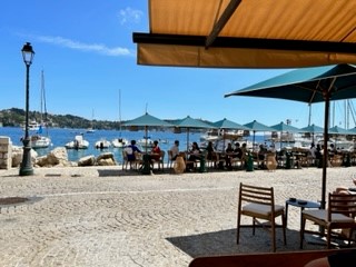 Better to be on solid FUCKING UPHILL ground. So, we trudged on. By the time we got closer to the restaurant, I was sweaty, sweary and ready to sit on the side of the road waiting for someone to take pity on me and carry me back to the hotel. Again, we are hearty Canadians, and we made it to the bar. It was small and we had a big table outside overlooking the water to see the sunset over the cliffs. Amazing. Then, the wind came up. The sun went down.