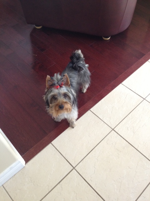 10:31:03 – I’m suddenly pounced on by a seven pound mound of hair that thinks my face has been dipped in bacon. After I extract her from my face I again, replace her back on her cushy brand new orthopedic puppy bed with the command ‘STAY’. She looks at me like this:
